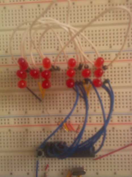 Observe que he conectado los dos dados juntos para que cada LED en uno está conectado al LED correspondiente en el segundo dado que está en el mismo lugar en el dado.