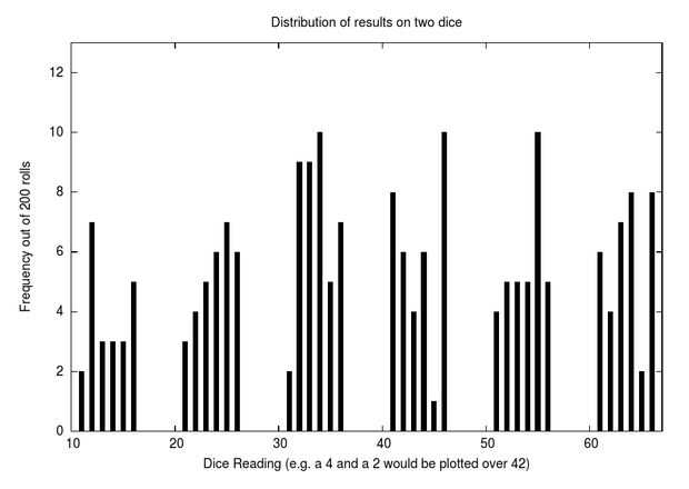 Si examina la sección del programa con la etiqueta "al azar:" verás el método que utiliza para obtener números al azar en los dados. Sólo inventé esto sobre la marcha y definitivamente no es el mejor método para obtener números aleatorios. El problema de conseguir números verdaderamente aleatorios de una computadora es difícil. La manera de hace la mayoría de las personas es similar a la manera lo hizo: utilizar las personas que usan el programa para generar el número aleatorio. Utilicé el tiempo necesario que pulse el botón para obtener una "semilla" para mi número al azar, ya que es difícil para usted tomar "exactamente" la misma cantidad de tiempo para pulsar el botón cada vez. Puesto que la cpu oscila en 16 millones de veces por segundo que es poco probable que usted puede presionar el botón en exactamente el mismo número de TCNT0 cada vez (a pesar de que es sólo entre 0 y 249) una vez que consigue ese número y guárdelo como una variable llamada "semilla" lo uso para generar dos números pseudo-random, uno para cada uno de los dados. Como se puede ver en el gráfico anterior que hice contando cuantas veces cada uno diferente rollo subió durante 200 rollos, no son todo lo que al azar (por ejemplo un 4 y un 5 no suben muy a menudo comparativamente--como puede verse en el gráfico, sólo sucedió una vez en rollos de 200), pero no está mal para un primer intento!