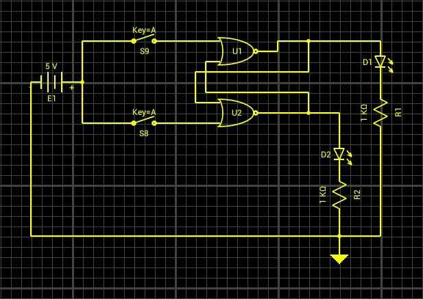 Como se puede ver por el diagrama simplemente he tomado una SR-cierre de dos puertas NOR y cableado de las entradas a 5V a través de un pulsador, y entonces alambré las salidas a través de un LED, luego una resistencia y luego tierra. Luego he probado en Droid Tesla y había encontrado que funciona exactamente como quiero. Si pulse uno de los botones LED se enciende y entonces la única forma para cambiar LEDs es pulsar el otro botón.
