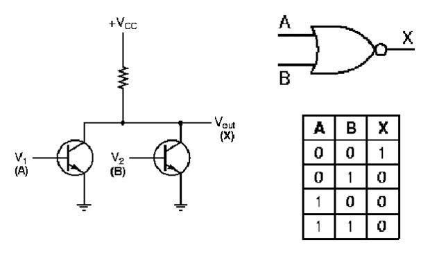 Mira la segunda foto. Se trata de un transistor NPN y podemos hacer una puerta NOR con dos de ellos. Un transistor funciona es que pones 5V en el pin del emisor, 0V en el pin del colector, y no pasará nada hasta que te ponen una pequeña corriente en el pin de la base. Si hay corriente en el pin de la base entonces el transistor actúa sólo como un simple alambre viejo. Si nos fijamos en el diagrama pasado que he dado puedes ver que la utilización de las bases como mis entradas y conectar la irradiacion a la tierra y el colector a 5V entonces si cualquiera de las entradas es en el Vout será derribado a tierra o 0V. Si ninguno de ellos son, entonces la Vout será el voltaje 5V de la fuente. Esta es la tabla de verdad de una puerta NOR.