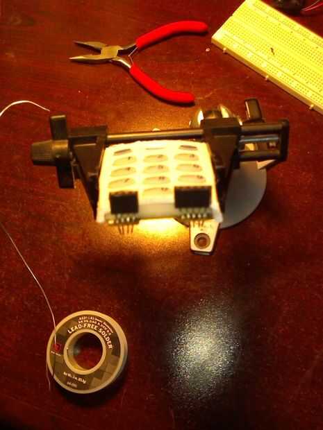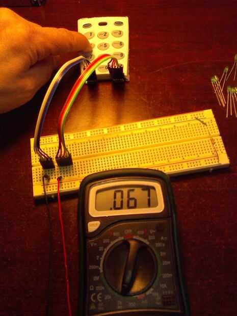 Ahora que los encabezados están conectados puede alambre a un protoboard, tomar un multímetro y probar las teclas de pegar el multímetro a través de pernos al azar y medir la resistencia. Esto le permitirá mapear las teclas. Es difícil ver cómo las llaves se conectan a las salidas mirando el circuito pero si se utiliza un multímetro puede conectarlo a cualquier dos pernos y luego presione los botones hasta que aparezca un número en la pantalla en lugar de un circuito abierto. Este será el pinout para esa clave.