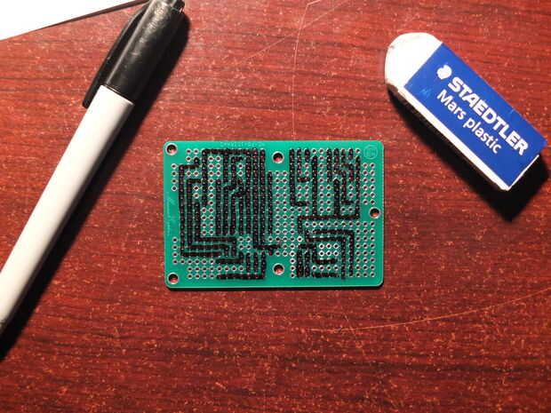 Primero tomar un rotulador y, mediante su diseño que trazó en el paso anterior, dibujar el circuito en el tablero. Es decir, trazar líneas para representar los cables. No dibujes nada en términos de componentes, sólo los cables de conexión como se muestra en la primera foto. Observe que al atornillar para arriba (y si eres algo como yo se atornillar cosas un montón de veces en estos pasos) puede utilizar una goma de borrar y borrar la línea. Hacer esto para ambos lados de la Junta.