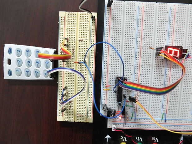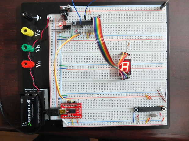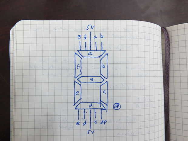Debo agregar que tienes que poner una resistencia entre el ánodo común de la pantalla y el riel de 5V. Elegí una resistencia de 330 ohm como de costumbre pero si te gusta le podía calcular la resistencia mínima necesaria para obtener el máximo brillo de la pantalla sin freírlos. Aquí está cómo hacerlo:
