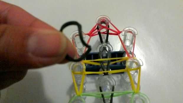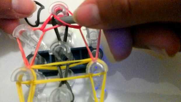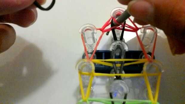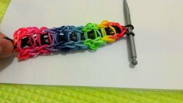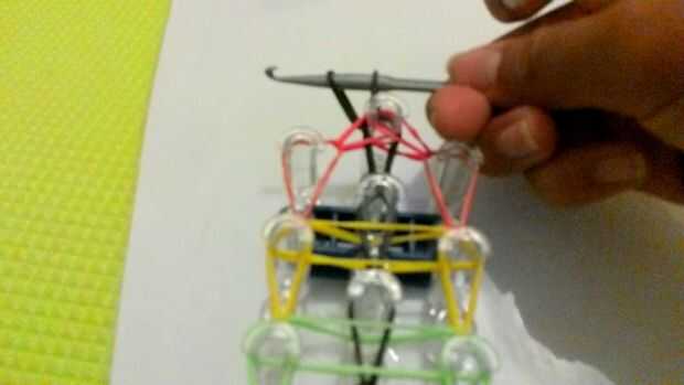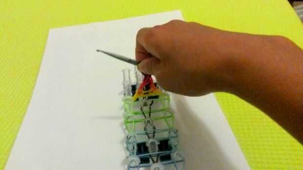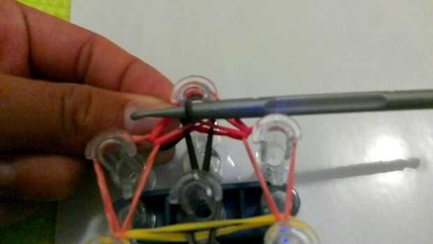 El gancho a través del pin central pasado y tirar que de color a través del palillo, pero no del todo.