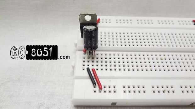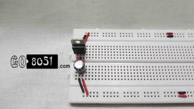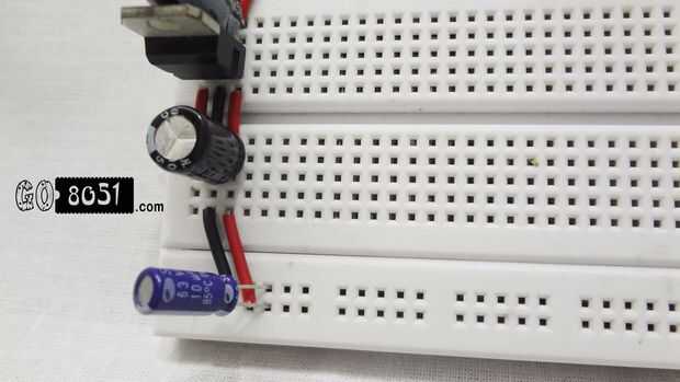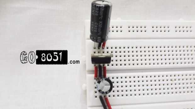 9. Coloque el condensador de 100uf entre los + ve y - ve líneas, es decir, sólo entre el + voltaje de la salida de 5v y la tierra del regulador.