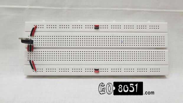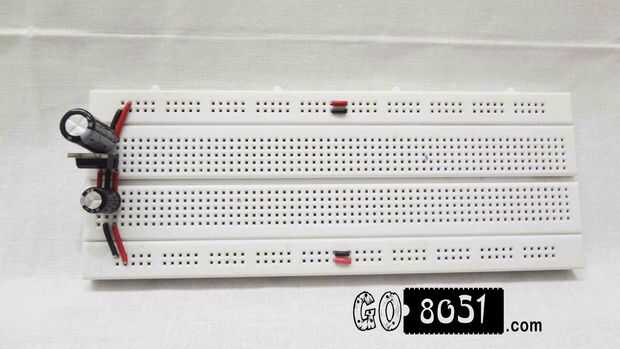 11. ahora ponga el capacitor de 10uf en la parte izquierda de la protoboard entre - ve y + ve líneas. Lo mismo del lado derecho también