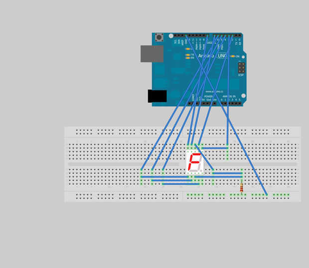 El circuito bastante sencillo es conectar el cátodo común a la tierra con una resistencia limitadora actual de 330 ohmios. Conectar los siete exhibiciones de segmento pin número 7 para arduino pin2, 6 b a arduino pin3, 4 (C) para arduino pin 4, 2 (D) para arduino pin5, pin6 arduino, arduino pin7, pin8 de arduino, 5 (DP) para arduino pin9 10 (G) 9 (F) 1 (E). Para el 2 º proyecto primero hacer el circuito multiplexado abajo y luego seguir estos patrones de conexiones. Segmento al pin 7, segmento B al pin 8, segmento C al pin 4, segmento D pin 3, segmento E al pin 2, segmento F al pin 6, segmento G al pin 5, Gnd1 via resistencia al pin 11, Gnd2 via resistencia al pin 9.