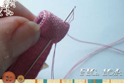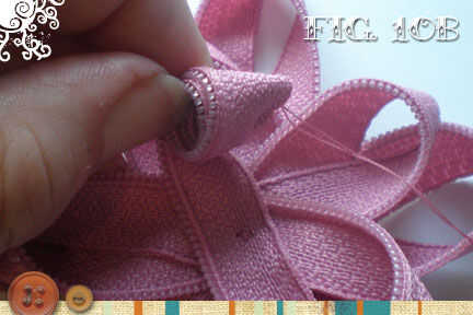 a partir del extremo de la cinta de la bucle sin cremallera, comience a rodar la cinta de la cremallera a sí mismo hacia el centro de la flor, asegurándose de que permanezca la puntada final "sin diente" cuando sea necesario (ver figs. 10A y 10B).