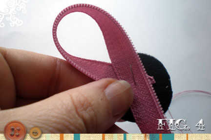 Tomar la cinta de la cremallera y enlacen hacia arriba y alrededor así que parece que figura 4. El lazo debe ser aproximadamente 2" de extremo a extremo. Coser el lazo en lugar a través del centro.