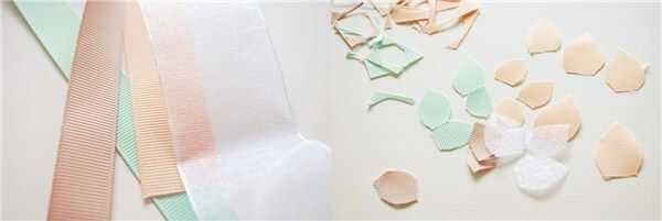Preparar varias cintas de grosgrain en diferentes colores y una cinta de organza; cortar las formas de pétalos y hojas.