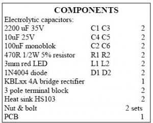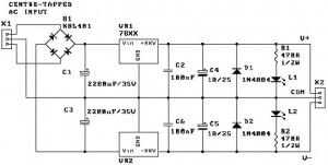 Esta doble fuente de alimentación lineal proporciona una fuente de alimentación de polaridad dual. Puede ser construido fácilmente para proporcionar hasta 1 amperio con la opción apropiada del transformador centro aprovechado y pares de regulador de voltaje 3-terminal a +-5V, +-9V, +-12V y así sucesivamente.