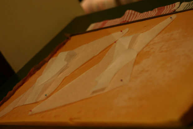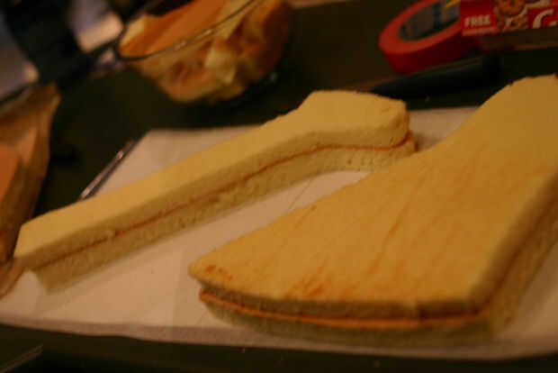 Mira la torta de hoja y me pregunto cómo se recorta todas las piezas, utilice papel encerado para hacer las plantillas (Asegúrese de que tiene derecho para arriba y mal hacia arriba las capas para que tenga una superficie plana en la parte inferior de la capa inferior y parte superior de su capa superior) y luego corte con un cuchillo! Poner todo el cortado pedazos de la torta en un recipiente para refrigerio.