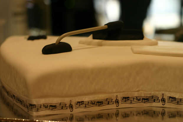 Doblar una aguja de tejer de cable para hacer varita wahwah y poner negro la guinda final a endurecerse. Cortar los detalles de los pisos endurecidos de glaseado que antes. Armar el pastel con glaseado real.