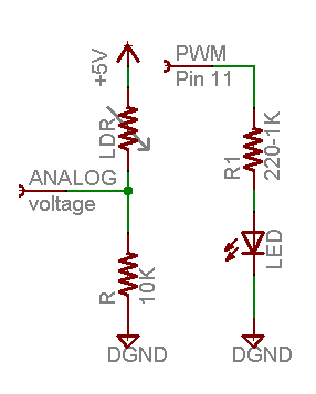 Este bosquejo se tome la lectura de tensión analógico y para determinar cómo brillante es la luz roja. Es más oscuro, será el más brillante del LED! Recuerde que el LED tiene que estar conectado a un pin PWM para que funcione, usar pin 11 en este ejemplo.