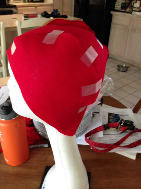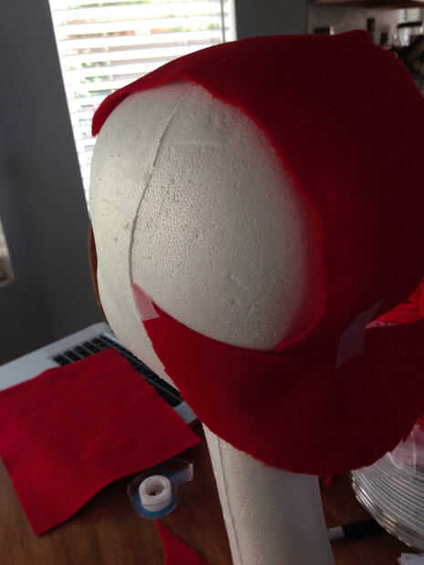 Con alfileres o cinta como lo hice aquí juntar las piezas de fieltro en la cabeza de peluca y averiguar la mejor posición para el fieltro. Asegúrese de que todo lo toca y la cabeza se cubre muy bien. Otra vez demasiado grande es fijable, demasiado pequeña es más difícil.