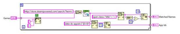 En el segundo cuadro de la estructura de planos secuencia, utilizamos el nombre de get y ID subVI que devuelve el nombre del juego que escribiste tal y como aparece en el vapor y el id de aplicación que corresponde a ese juego. Al hacer doble clic sobre el subVI, debe abrir y debe buscar el diagrama de bloques como la foto de arriba.
