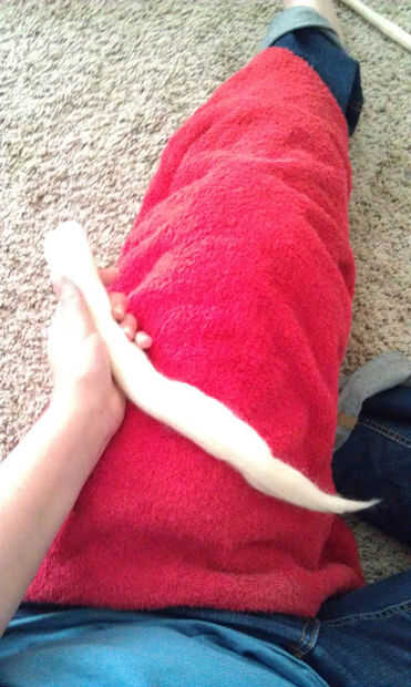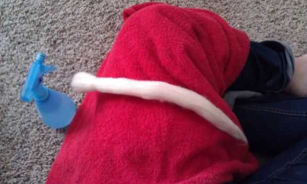 3. para la siguiente parte usted necesitará una botella de spray con agua (y jabón un poco), y una toalla envuelta alrededor de su pierna. puedes ver aquí la toalla que usa es realmente muy pequeña y que hace este proceso mucho más difícil tenía que ser-debido a la lucha con lo estúpido para mantenerlo en lugar-It ayuda si de lo plano su bastante grande que puede sentarse en él y estirarlo no hay golpes!