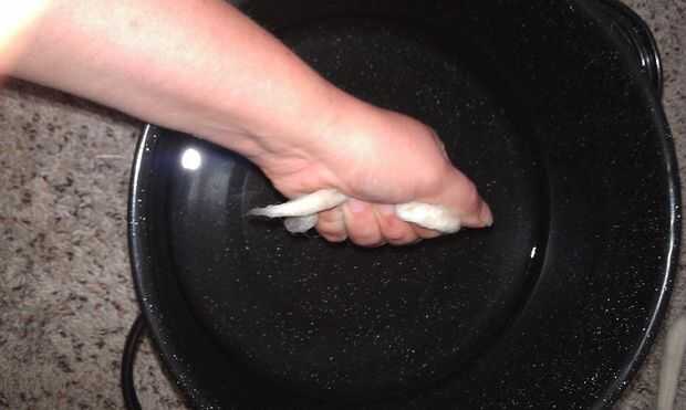 Pescado hacia fuera y exprimir la mayoría del agua de la lana. Si quieres, utilice un palillo para salir de allí. Utilice uno para meter la lana hacia abajo así empapa y luego a los peces vuelve a salir. el agua caliente es caliente!