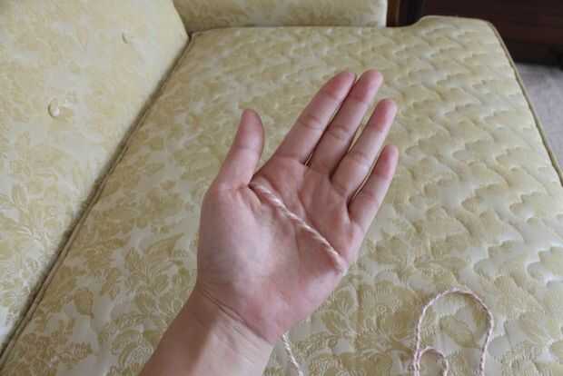 Tomar la punta de la bola de hilo y que vienen de atrás hacia la palma de la mano de non-dominate. No cortar el hilo de la bola. No sabes cuánto hilo se necesita todavía.