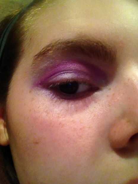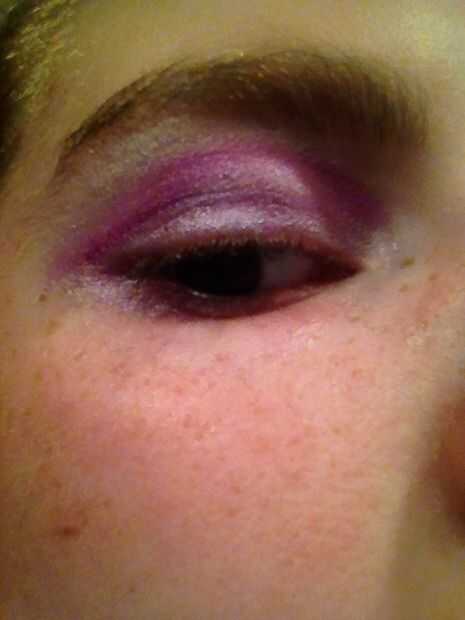 Con violeta oscuro, hacer un movimiento de arco iris, sombreado en la parte superior de tu párpado, si haces esto dos veces, se gire mejor y luego rellene la ultima parte justo debajo de tu frente con blanco