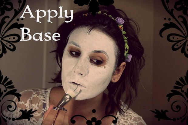 Aplicar una base de color blanco crema en toda la cara, dejando espacio alrededor de los ojos donde usted va relleno con negro. Estoy usando Kryolan Aquacolor, que recomiendo ya que no se seque o crack como payaso blanco o el crema maquillaje que comprar en la supertienda de Halloween tiende a hacer. También es mucho más fácil en la piel. Usando un cepillo de base mojada, apliqué varias capas hasta que parecía liso y opaco, luego con una capa pesada de polvo Ben Nye Super blanco.