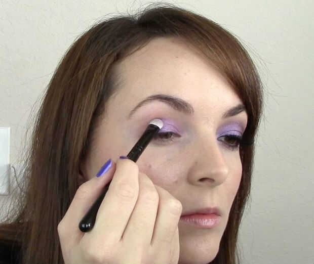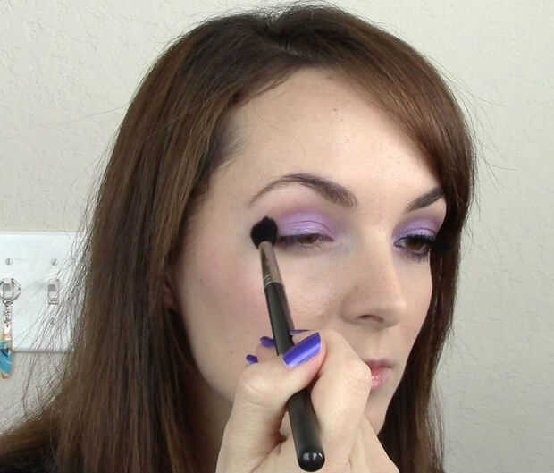 Tomar el mismo pincel mezclado que hemos utilizado antes y utilice para ayudar a mezclar el morado. No tienes que añadir cualquier sombra de ojos al pincel.