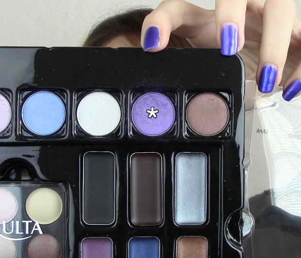 Con un cepillo de sombra de ojos, tome una trémula sombra de ojos púrpura y los sobre los párpados.