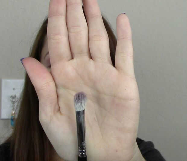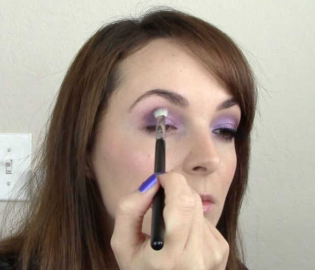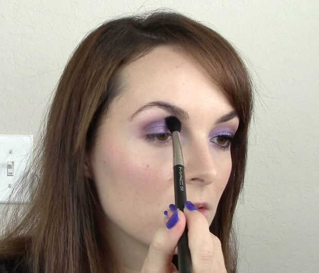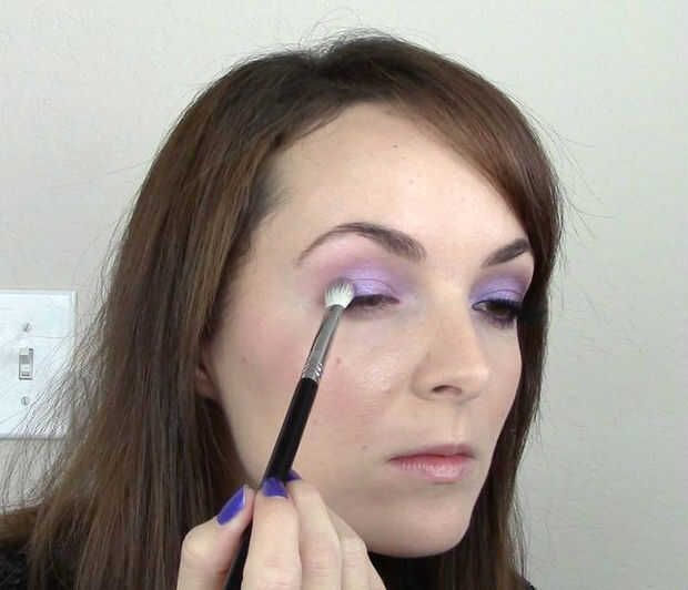 Tomar otro pincel de mezcla que se quede enganchado (yo usé un pincel de Sigma E 25) y aplicar una sombra de ojos púrpura más oscuro en la esquina externa del ojo y en el pliegue. Asegúrese de que la sombra de ojos es mate no trémulo.
