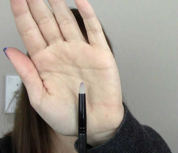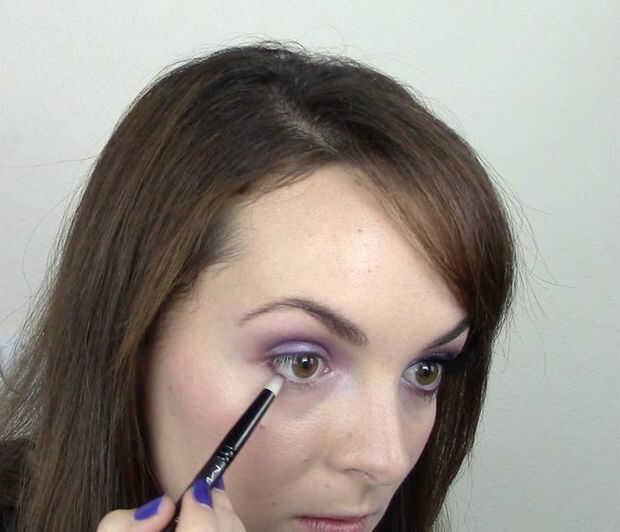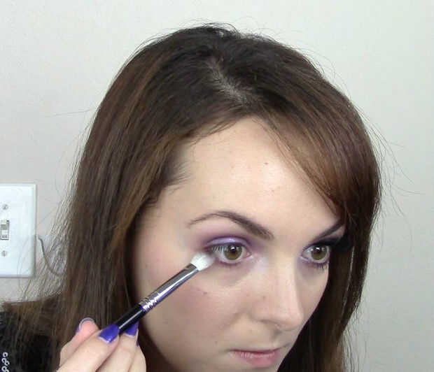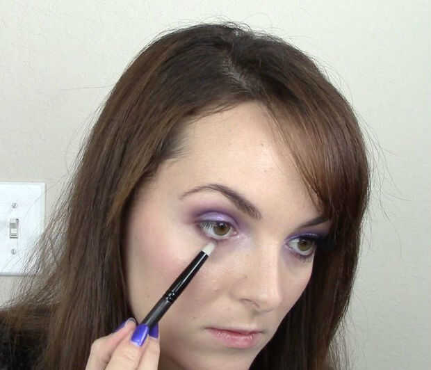 Tomar un pincel de lápiz y la sombra de ojos púrpura mate se aplica a la línea de pestañas inferior. Mezcla.