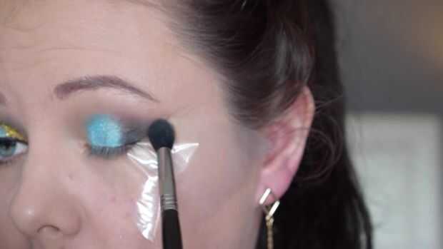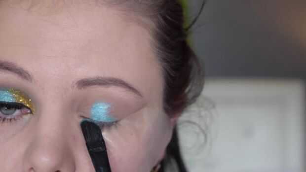 Entonces con un tono marrón claro sólo tomar esto y esto se funden en el pliegue y utilizarlo como una pantalla de transición. Esto va a ayudar a los otros colores de mezcla hacia fuera. Luego toma un pincel mojado aplique un color azul intenso muy brillante y esto se aplica en el centro de la tapa. Luego tomar una sombra negra que necesita esta en la esquina exterior y esto se funden en el pliegue del ojo. Luego con algunas pestañas pegamento aplicar esto en la esquina interna del ojo asegurándose de que no entra en mis ojos. Luego aplico un brillo oro aquí. Luego tomando mi mullido cepillo voy sobre todo para asegurarse de que es suave y mezclado.