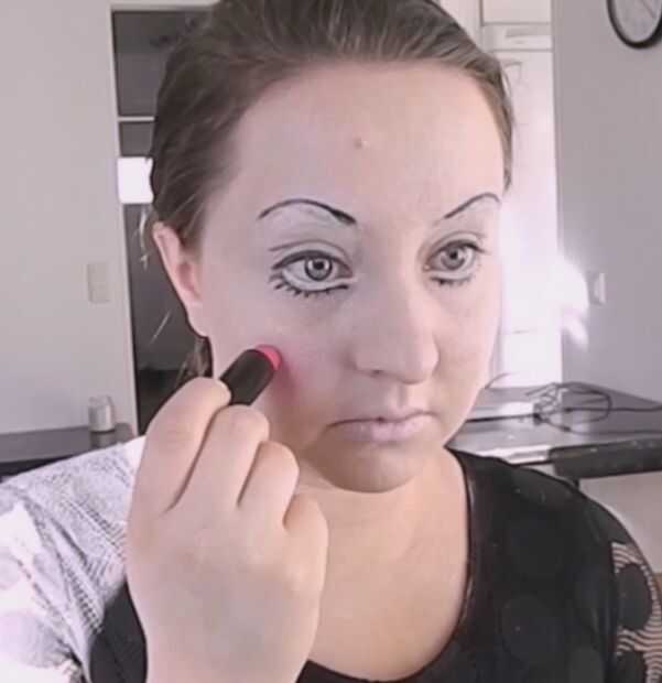 Hice pequeños "círculos" en mis mejillas. Me olvidé de comprar el rubor real usé bebé labios lip stick (rosa).