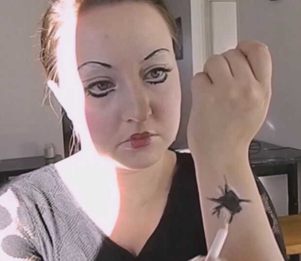 Tutorial de maquillaje de HalloweenPaso 1: cara.1. aplicar una base y 2. polvo3. y 4. Sombras, usar sombra de ojos marrón med, hacer sombras a tus mejillas y narizPaso 2: ojos.5. 6. y 7. Utilizar lápiz de ojos negro y hacer líneas a tus ojosPaso 3: "