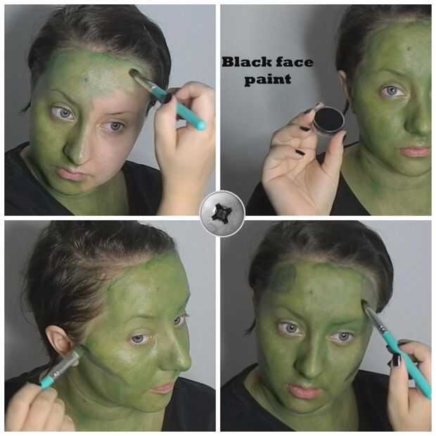 Tutorial de maquillaje de bruja HalloweenPaso 1: la piel. 1. Utilice la pintura de cara verde y aplicarlo a mi cara y el cuello.2. usar pintura negra y hago sombras a mi nariz y mejillas.Paso 2: las arrugas.Usted debe ver el video que usted puede rea