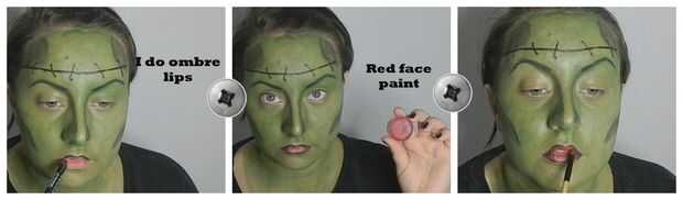 Tutorial de maquillaje de bruja HalloweenPaso 1: la piel. 1. Utilice la pintura de cara verde y aplicarlo a mi cara y el cuello.2. usar pintura negra y hago sombras a mi nariz y mejillas.Paso 2: las arrugas.Usted debe ver el video que usted puede rea