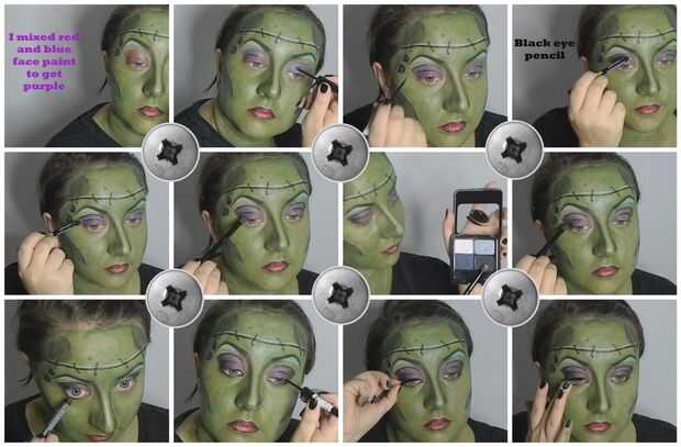 Tutorial de maquillaje de bruja HalloweenPaso 1: la piel. 1. Utilice la pintura de cara verde y aplicarlo a mi cara y el cuello.2. usar pintura negra y hago sombras a mi nariz y mejillas.Paso 2: las arrugas.Usted debe ver el video que usted puede rea