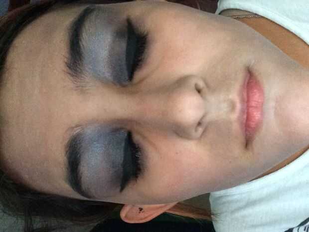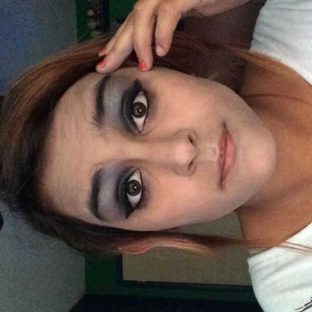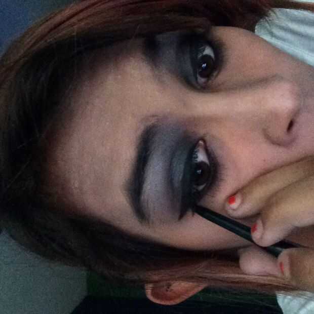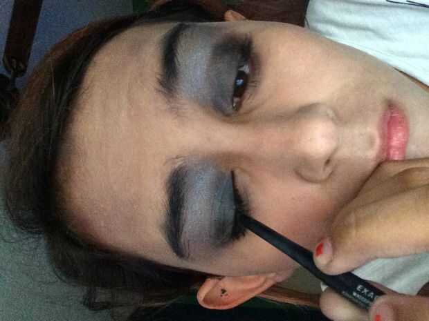 Coge el lápiz y escuchen! Primero lo haremos sobre el ojo. Usted puede hacer esta línea tan gruesa como quieras que yo voy por ahi de espesor líneas. Salida de línea de un centímetro de sus ojos y ángulo hacia arriba. Cuando se hace el revestimiento inferior, va como lejos hacia fuera como usted hizo con la parte superior y el ángulo hacia abajo. Debe haber un espacio entre las salidas superior e inferior del ala. Puede completar con otra ala o dejarlo.