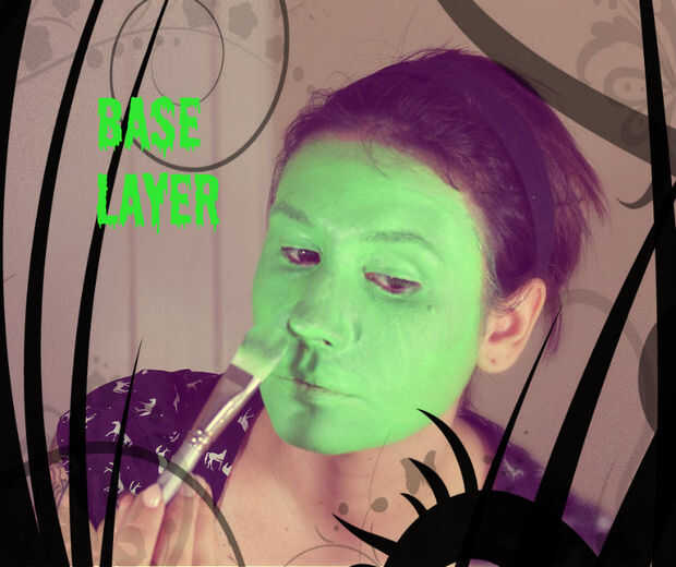 Comenzar aplicando imprimación y luego pintura su toda la cara (y cuello y pecho si te estas haciendo demasiado) con un tono verde medio. Comenzó con una capa de Kryolan Aquacolor en blanco (ya es todo lo que tenía) dar algo al pigmento para agarrar a, luego aplicar varias capas de un color verde brillante de paleta Wolfe FX hasta que el color era totalmente opaco. Alternativamente, podría usar un verde Aquacolor o MAC Chromacake, o pinta tu cara blanca y aplicar sombra de ojos verde todo. Con una capa de polvo translúcido, mi favorito es polvo sin Color de RCMA.