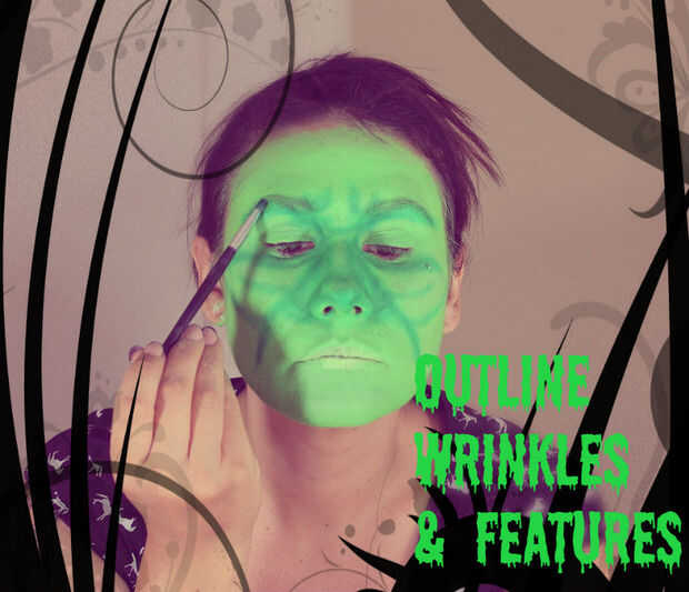 Usando un cepillo pequeño detalle y una sombra de ojos verde oscuro, las arrugas del contorno y características. Hizo una cara enfadada y luego rellena las arrugas y pliegues. Luego he añadido un contorno de nariz ancha, ojos extra y las arrugas de la mejilla, un hoyuelo en mi barbilla y pliegues nasolabiales extra ancho.