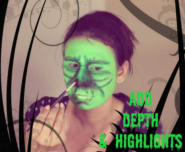 Una vez que estés feliz con la forma de sus pliegues, arrugas y detalles, van sobre ellos con un cepillo para detalles incluso más pequeño y sombra de ojos negro. Luego, usando un cepillo pequeño sombra de ojos suaves y un ligero toque, utilice alguna sombra de ojos marrón oscuro para agregar profundidad, mezcla y suavizar las líneas. Luego mezcla ligeramente alguna sombra de ojos amarillo entre los contornos para resaltar.