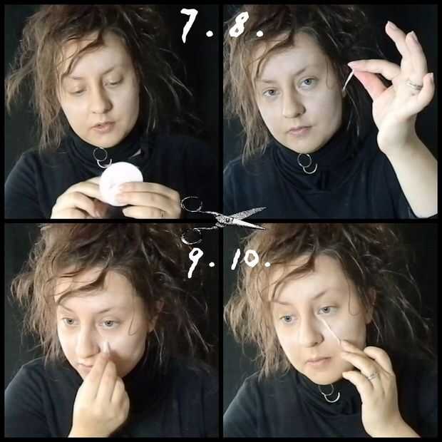 Tutorial de maquillaje de Halloween fantasmaPaso 1: cara1. and 2. Aplicar un pegamento a mis cejas.3. and 4. Pinto mi rostro, cuello y manos con pintura de cara blancaPaso 2: labios5. and 6. Aplicar lápiz de labios blanco a mis labios.Paso 3: ojos.7.