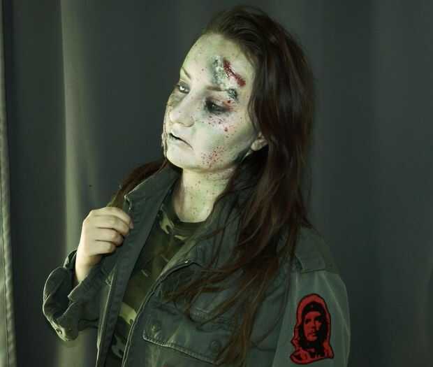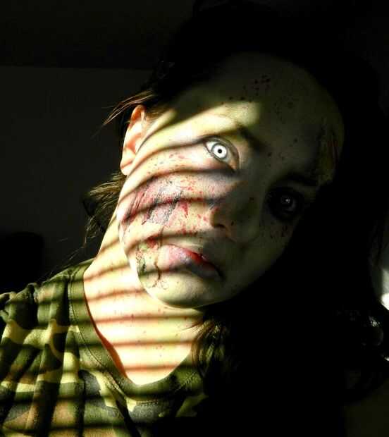 Tutorial de maquillaje de HalloweenPaso 1: cara.1. aplicar una base y 2. polvo3. y 4. Sombras, usar sombra de ojos marrón med, hacer sombras a tus mejillas y narizPaso 2: ojos.5. 6. y 7. Utilizar lápiz de ojos negro y hacer líneas a tus ojosPaso 3: "