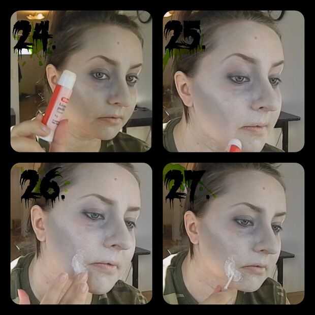 24. y 25. Aplicar pegamento de manía a mi mejilla (o lo que se llama esa parte)