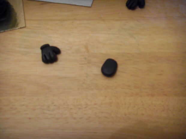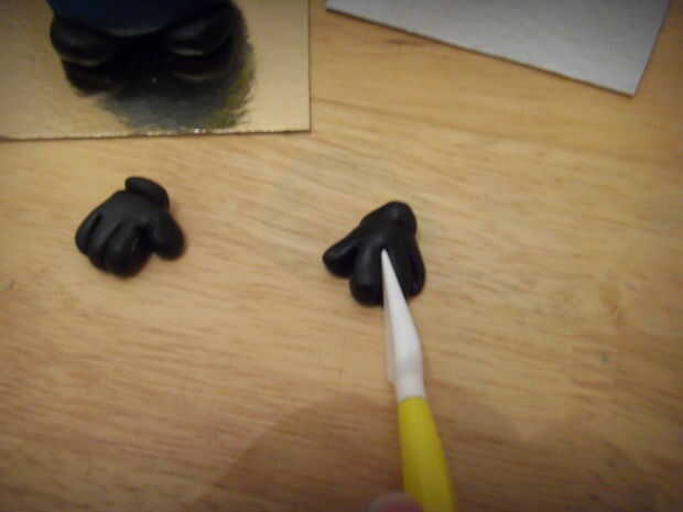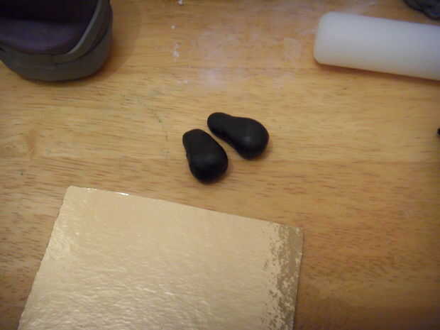 Rodillo 4 bolas medianos negro para las manos, les aplane ligeramente en óvalos, agregar una bola pequeña, aplanada de color negro para hacer los puños.