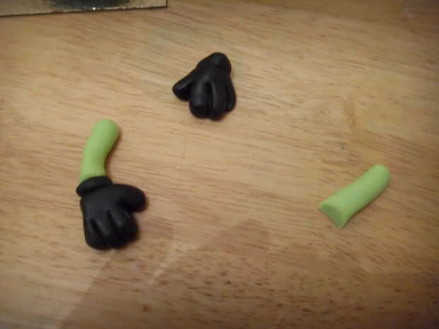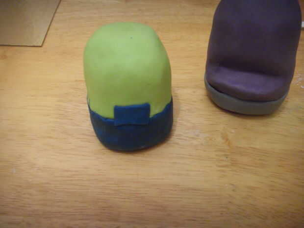 Rodillo 2 salchichas delgadas de color verde, agregar también las manos y coloque el cuerpo como los brazos. Repita en púrpura.