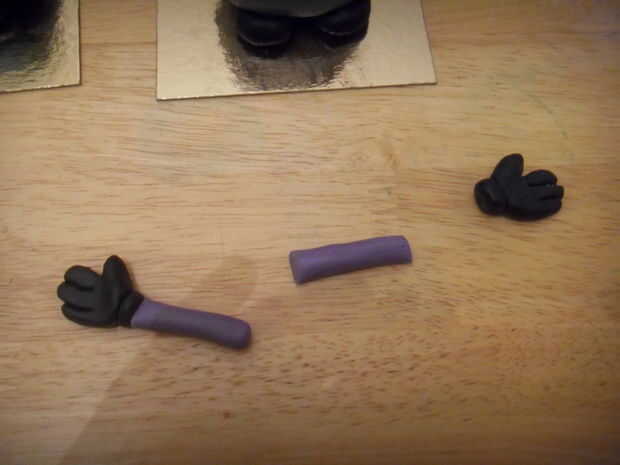 Rodillo 4 bolas de tamaño medianos de pasta de azúcar negra en forma de pera, aplanar la parte estrecha. Agregar en tu pastel como pies. Pegar la torta a una junta (o lo que está presentando en).