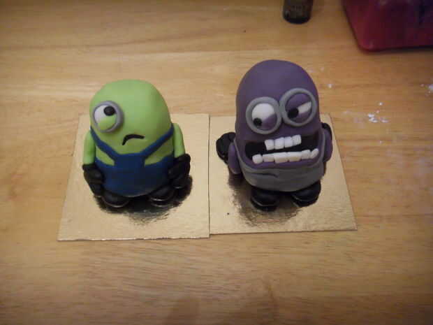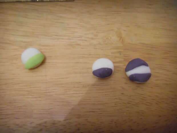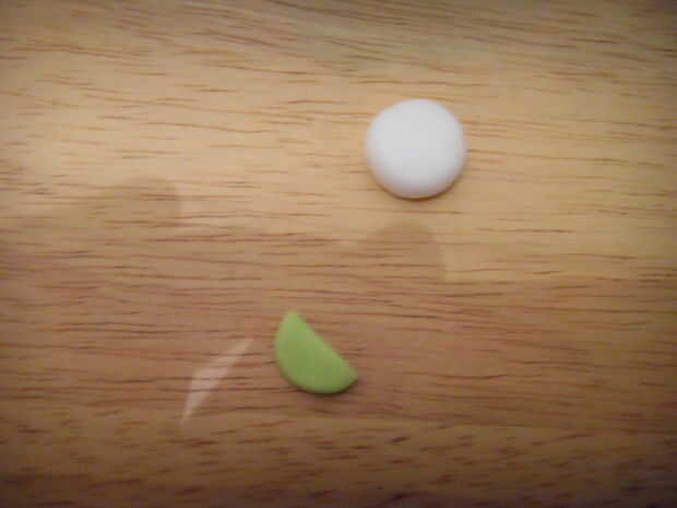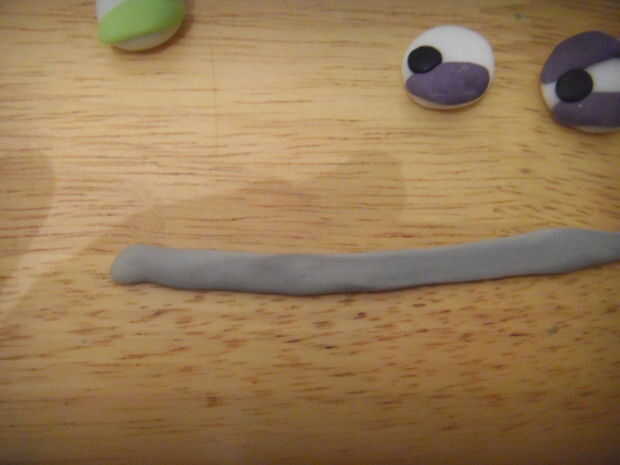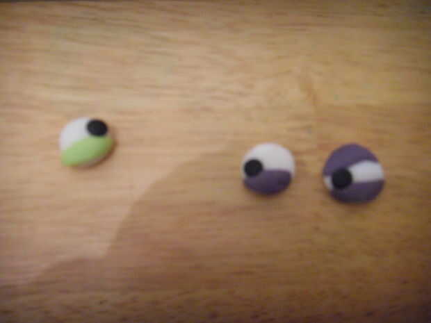 Rodar una pelota verde aplanar hacia fuera y cortar por la mitad para hacer un párpado. Repetir con 2 círculos de púrpura.