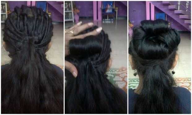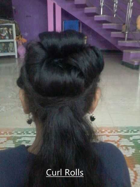 4. luego pellizcar el extremo entre el dedo pulgar y los dedos. Ahora salga el enrollamiento de los dedos y rodar hacia la cabeza y fijar con horquillas.
