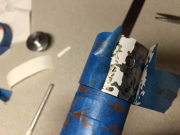 Ahora cuidadosamente despegue la parte superior más tira de la cinta de enmascarar, doblándolo de nuevo en sí mismo para conseguir un ángulo de pelado agudo. Hacer lo mismo con las restantes capas si es necesario más de uno para cubrir la plantilla. Ahora usted puede terminar el otro extremo de la plantilla de la aplicación, asegurándose que los bordes se alinean correctamente. Retire con cuidado el resto de la cinta de enmascarar, dejando su plantilla completa.