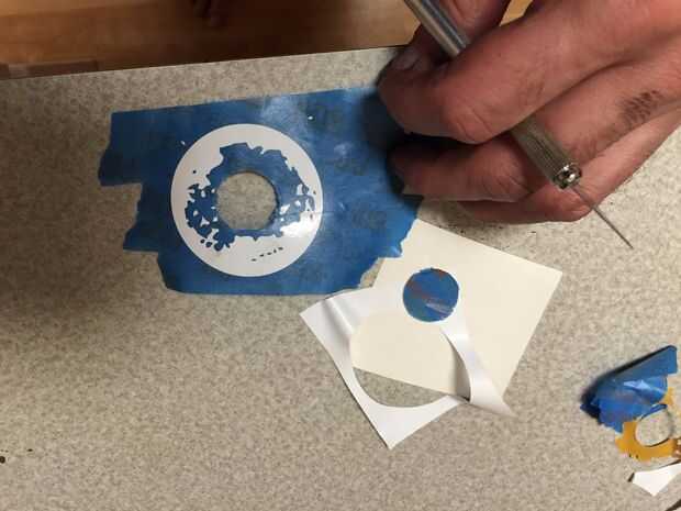 Preparación de la plantilla como antes y utilizar una cuchilla exacto para cortar el centro del círculo, una vez que lo tienes en la cinta de enmascarar.