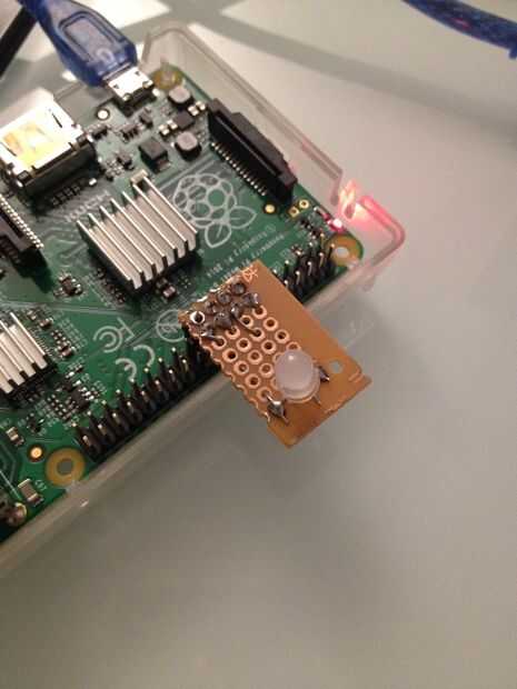 Todos los componentes son un RGB led, cátodo de la comuna, tres resistencias (120 Ohm + 120 Ohm + 100 ohmios), una pinplug de frambuesa Pi GPiO y un pedazo de perfboard.